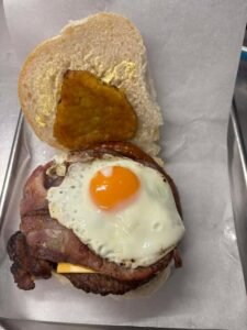 Burger, 1 Sausage, 1 Bacon, Egg, Black Pudding or Mushroom & Cheese Slice on a bap