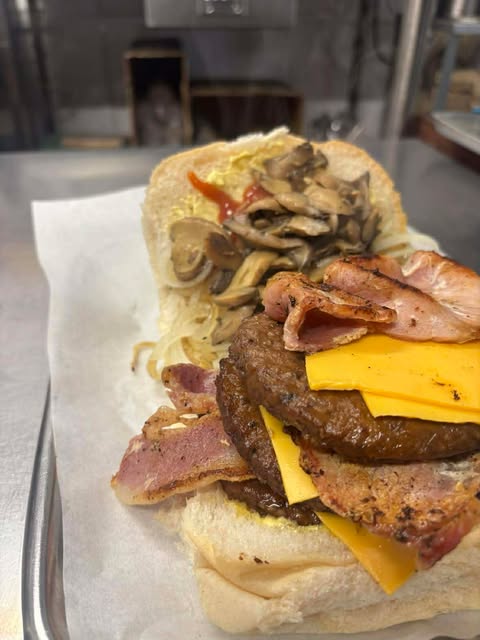 3 x Burgers, 3 x Cheese, 3 x Bacon, Mushrooms, Onions on a bap